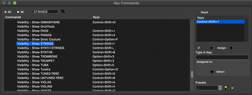 I then mapped the two new editor presets to key commands. You’ll find this in the Cubase ‘Edit’ menu, under ‘Key Commands’. To locate the preset you created, use the search field above the ‘Commands’ section (Shown below with the search term ‘STRINGS’).