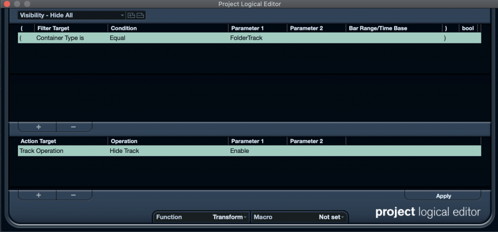 First, I created a preset to hide all folder tracks. I named this ‘Visibility – Hide All’