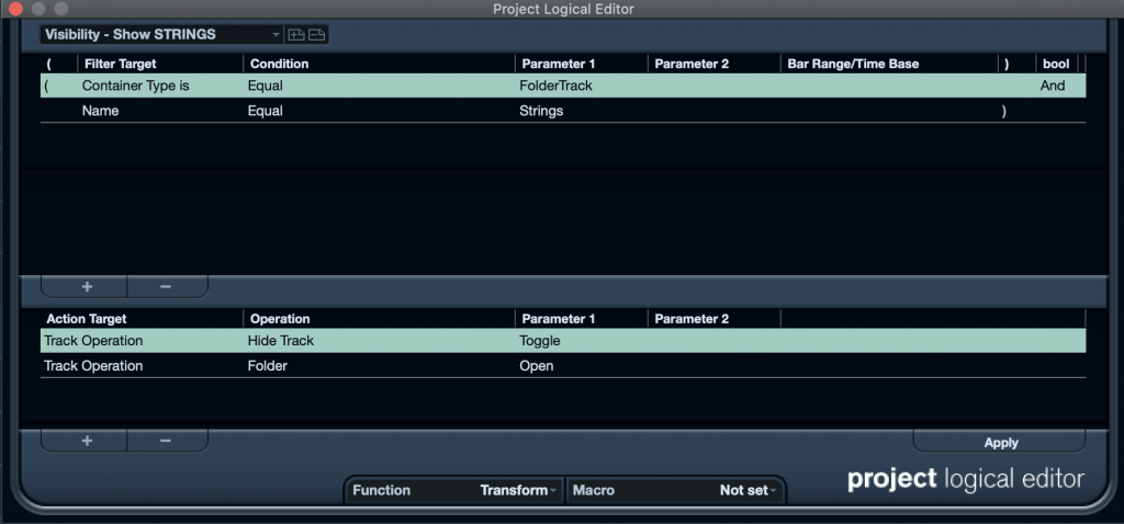 You can create and use Logical Editor presets to hide or unhide specific folders, which Cubase refers to as visibility. I’ll describe the process for hiding everything apart from the Strings.